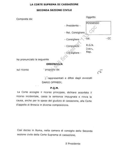 Corte Suprema di Cassazione - Accoglimento Ricorso con relativa annullamento Sentenza Impugnata e Rinvio alla Corte d'Appello di Brescia. Emanazione della Suprema Corte di un principio di diritto in tema di usucapione e possesso di bene in comproprietà in pieno accoglimento di quello proposto dall’Avv. Offredi nel ricorso. Sentenza oggetto di due pubblicazioni sulle principali riviste giuridiche italiane (“Diritto e Giustizia, 2022” e “giustiziacivile.com, 2022”).