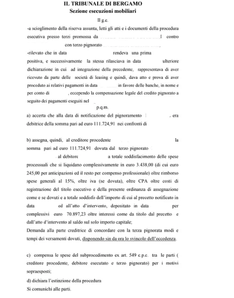 Tribunale di Bergamo - Accertamento di un credito per € 111.724,91 in sede di giudizio di accertamento di un pignoramento presso terzi.