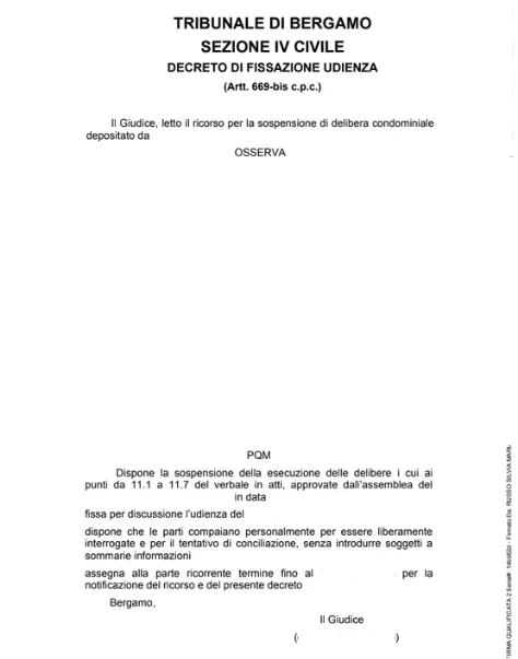 Tribunale di Bergamo (Sezione Civile) - Sospensione inaudita altera parte di Delibera Condominiale in materia di Superbonus che ha evitato all'assistito di dover corrispondere decine di migliaia di euro di lavori..